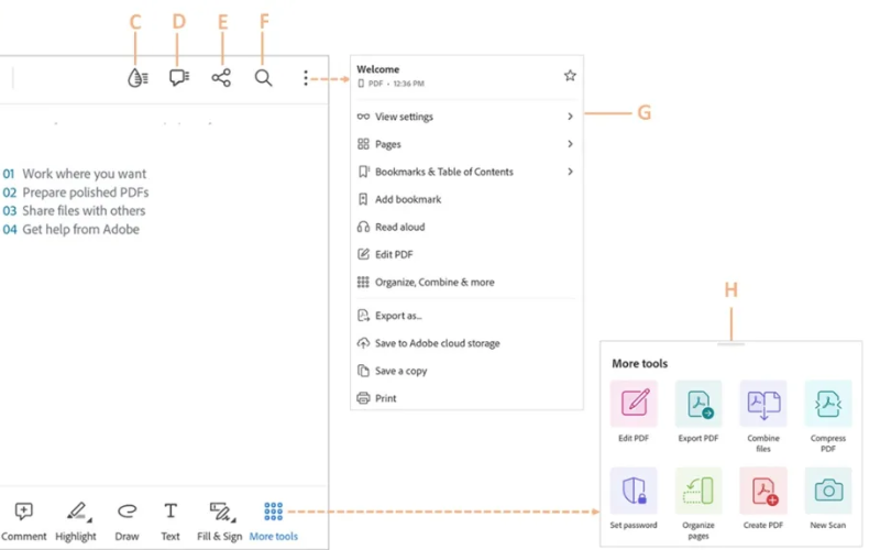 Tích hợp Adobe Document Cloud: Người dùng có thể lưu trữ tài liệu của họ trên Adobe Document Cloud và truy cập chúng từ bất kỳ thiết bị nào, giúp dễ dàng chia sẻ và cộng tác với người khác.