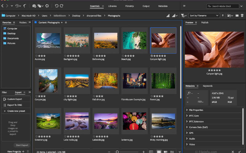 • Xem trước linh hoạt: Phần mềm Adobe Bridge cung cấp khả năng xem trước linh hoạt, cho phép người dùng xem nhanh nội dung của các tệp trước khi mở chúng. Tiện ích xem trước giúp tiết kiệm thời gian và tăng hiệu suất làm việc. Bạn có thể xem trước hình ảnh, video, âm thanh và các loại tệp truyền thông khác trực tiếp trong Adobe Bridge.