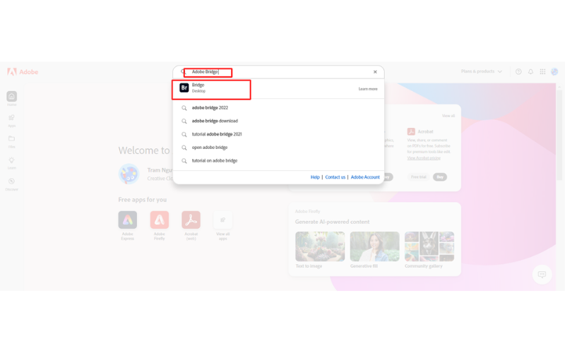 • Bước 2: Tại trang chính của Adobe, nhập “Adobe Bridge” vào thanh tìm kiếm và nhấn Enter.
