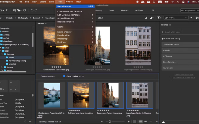 • Xử lý hàng loạt (Batch Processing): Adobe Bridge cung cấp tính năng xử lý hàng loạt mạnh mẽ, cho phép bạn thực hiện các thao tác trên nhiều tệp tin cùng một lúc. Bạn có thể áp dụng các bộ lọc, điều chỉnh màu sắc, thay đổi kích thước, đổi tên và xuất các tệp tin theo các cài đặt tùy chỉnh. Tính năng xử lý hàng loạt giúp tăng tốc quy trình làm việc và tiết kiệm công sức khi bạn cần áp dụng các thay đổi chung cho một nhóm hình ảnh.